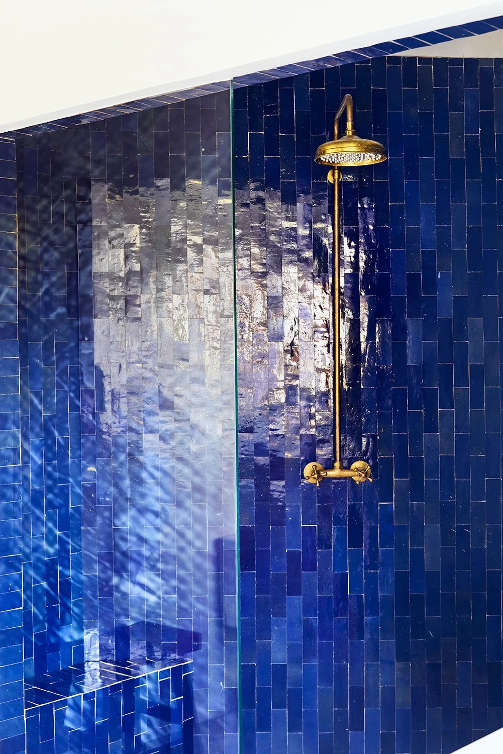 The large outdoor area has a swing chair, dining table, sunbeds and stone shower.