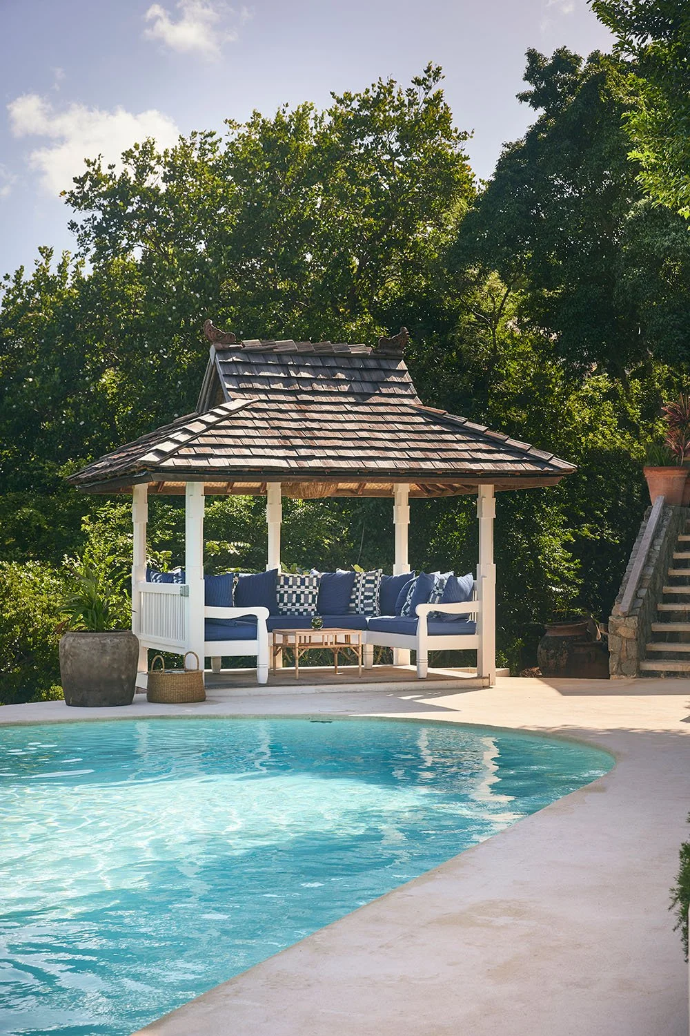 The pool is surrounded by a cabana, sunbeds, loungers and an outdoor dining table.