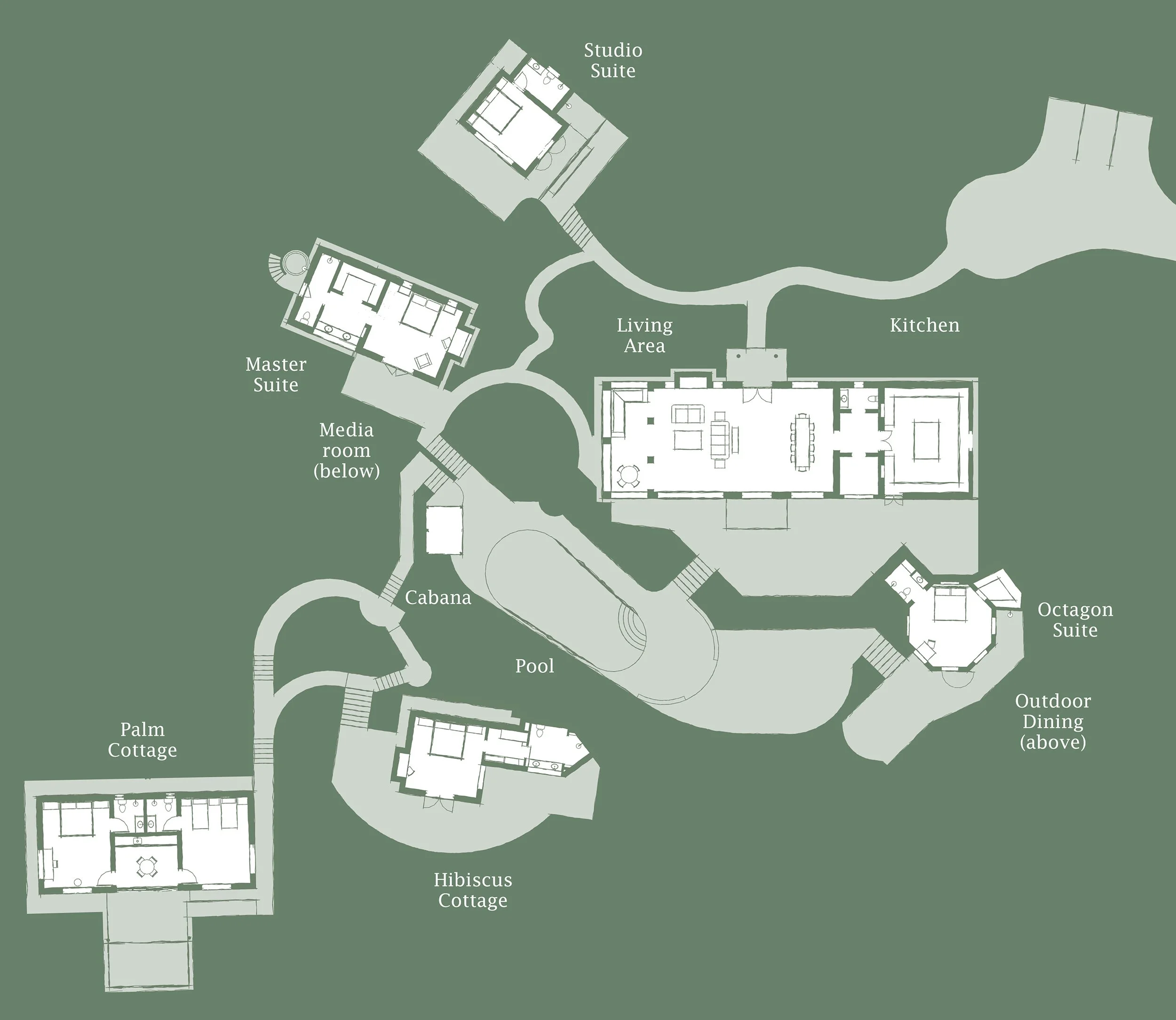 Sea Fan cottages are located across the scope of the landscape, with parking at both top and bottom of the property.